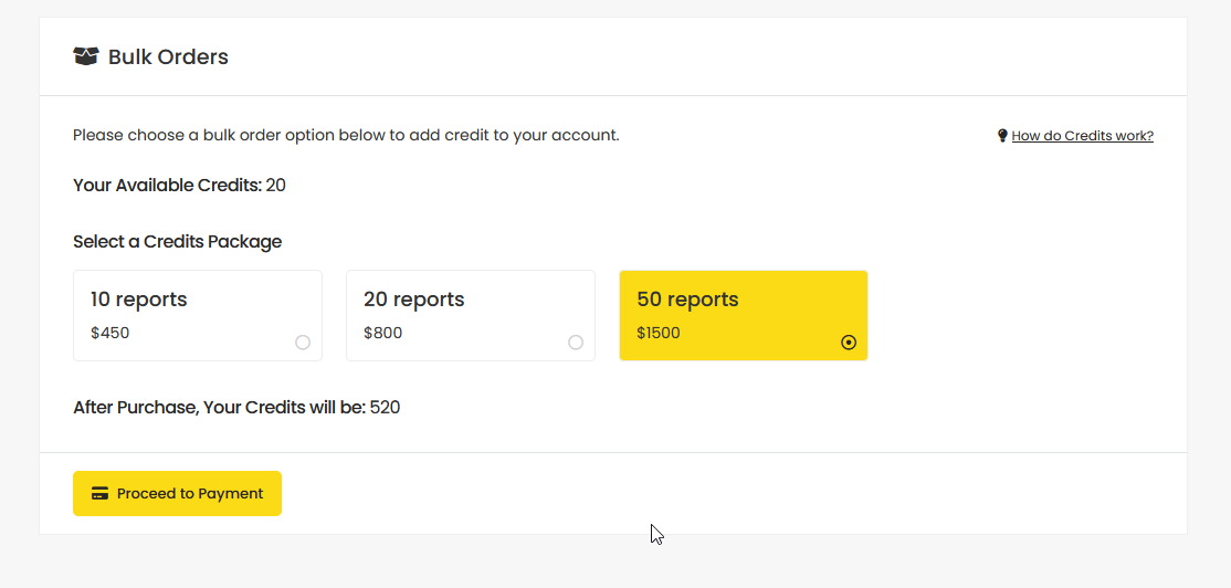 Pre-purchasing report credits is the cheapest way for regular users to get a BIG discount on reports. Essentially you pre-purchase blocks of credits that can be used to order reports at any time and can be used to order any of our products or services at a discount.