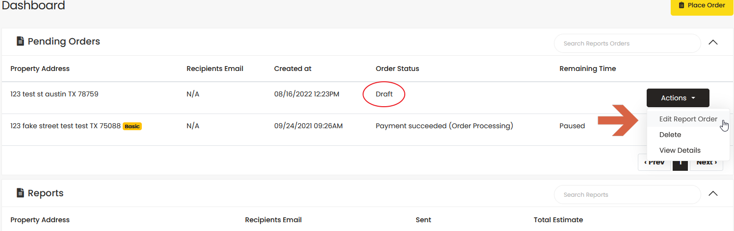 Please click Actions, then Edit Report Order to complete your payment and submit your report for processing.